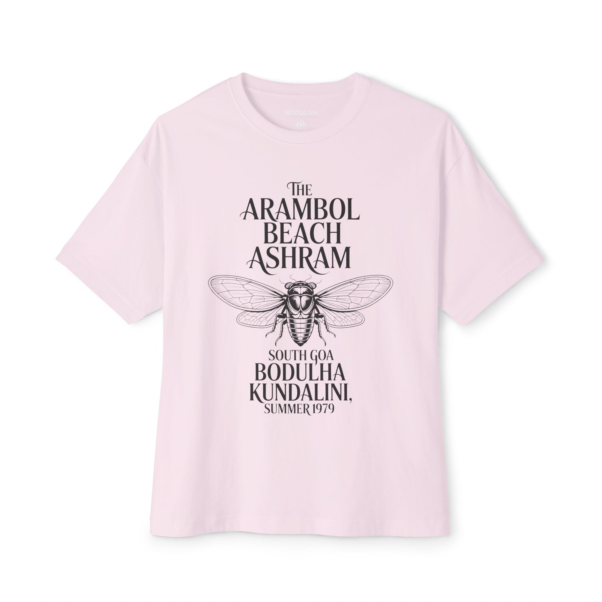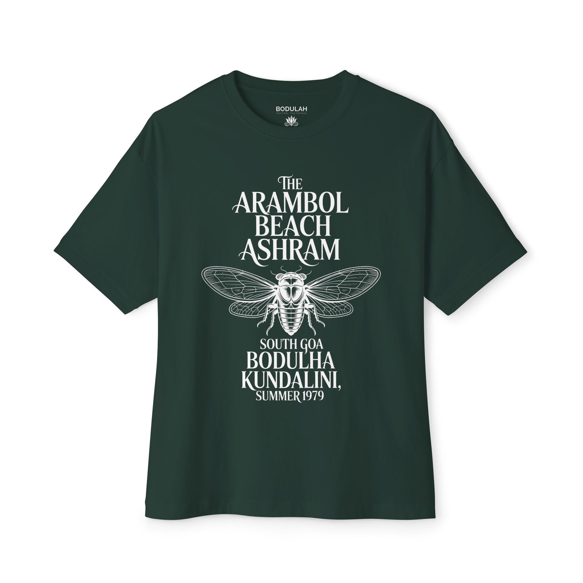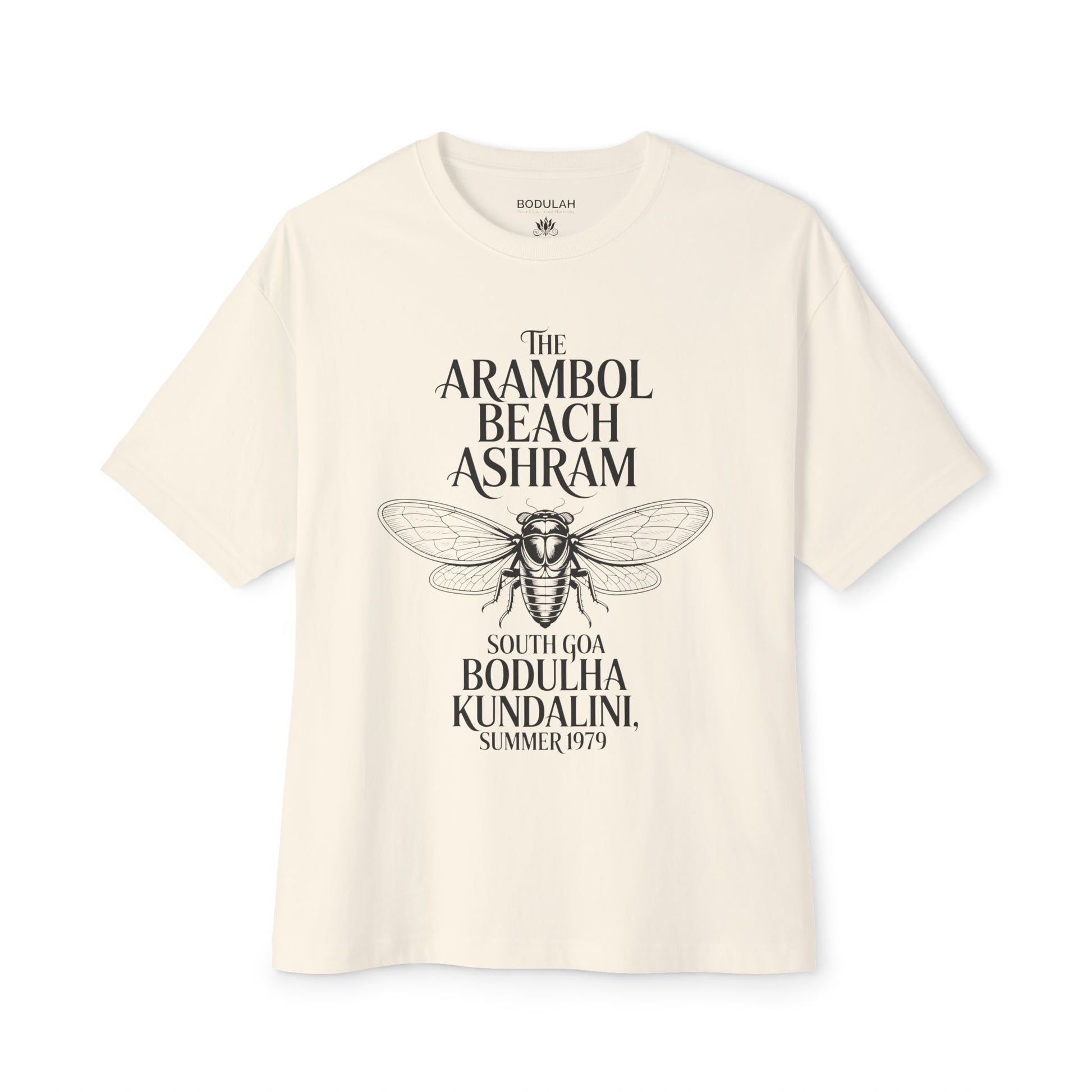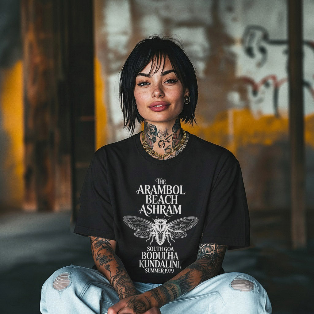 Step back into the sun-drenched spirit of Goa, Summer 1979. The Arambol Beach Ashram Tee is a tribute to barefoot days, salt-kissed air, and the awakening energy of Kundalini rising by the ocean. Featuring a finely detailed cicada - a timeless symbol of transformation and renewal - this oversized, boxy fit tee is more than clothing; it’s a portal to freedom, music, and soul-searching by the shoreline.