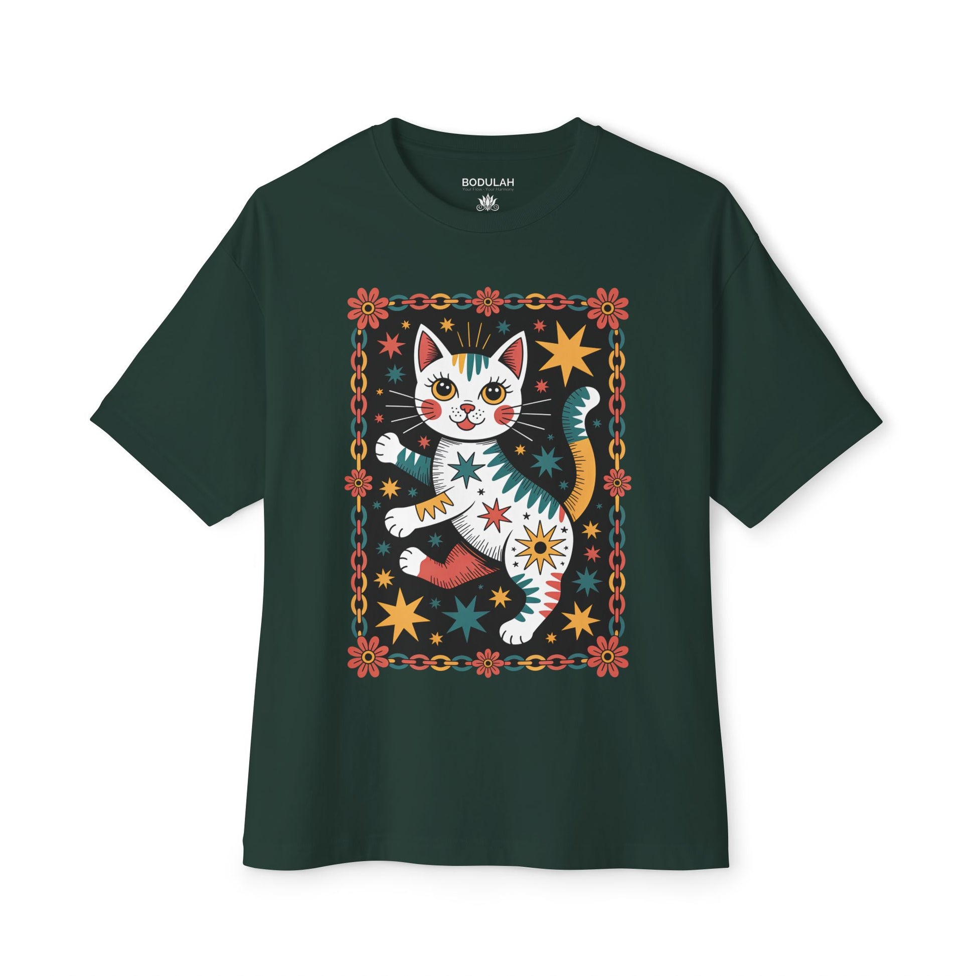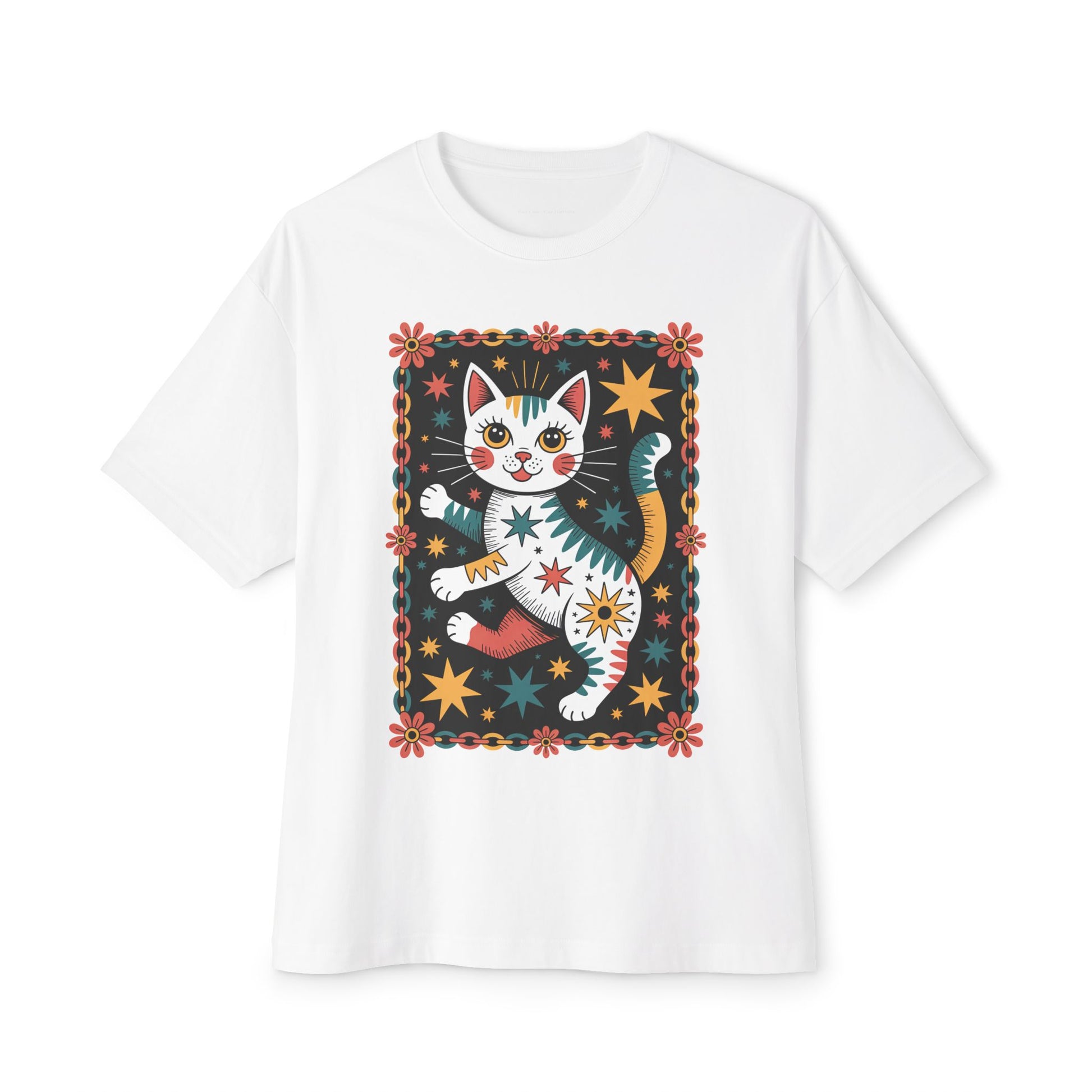 Enjoy pure bliss with the Cosmic Dancing Cat oversized boxy t-shirt. This vibrant design features a playful cat surrounded by radiant stars and blooming flowers, capturing the spirit of joy, luck, and cosmic connection. Printed on a relaxed oversized fit, it’s crafted for comfort and creativity - perfect for yoga, festivals, or simply bringing light-hearted energy into your everyday wear. Wear it as a statement of happiness, freedom, and cosmic play.