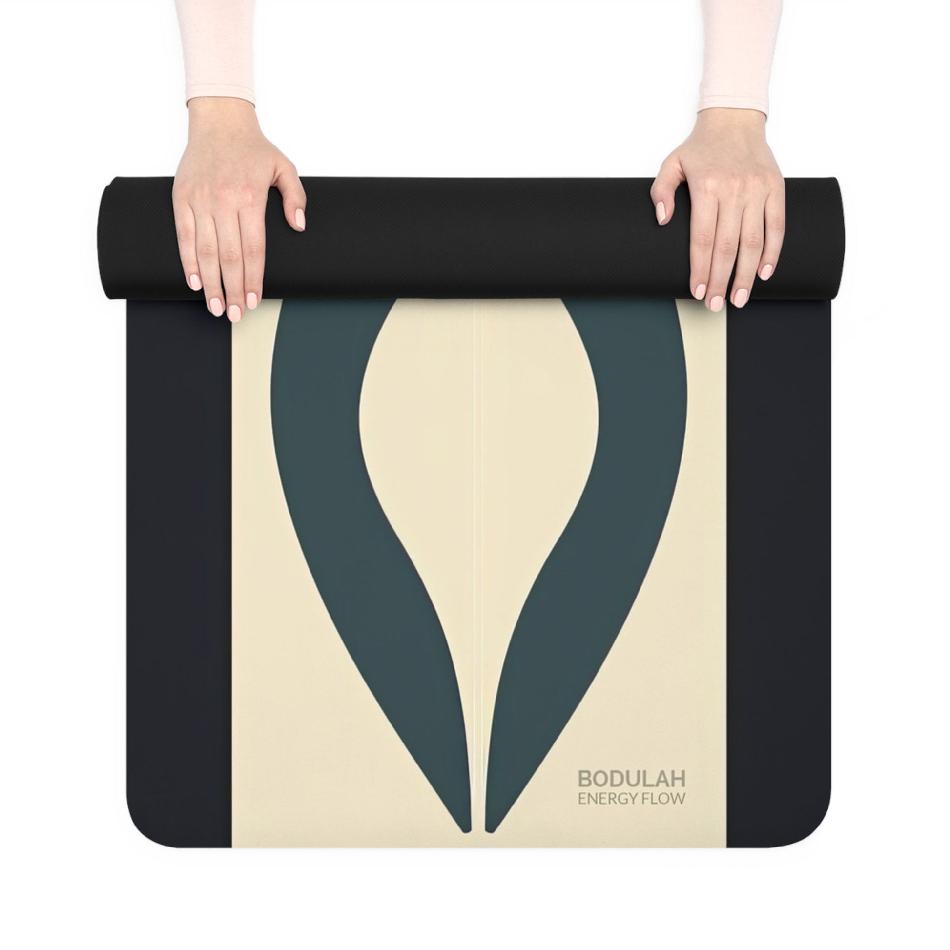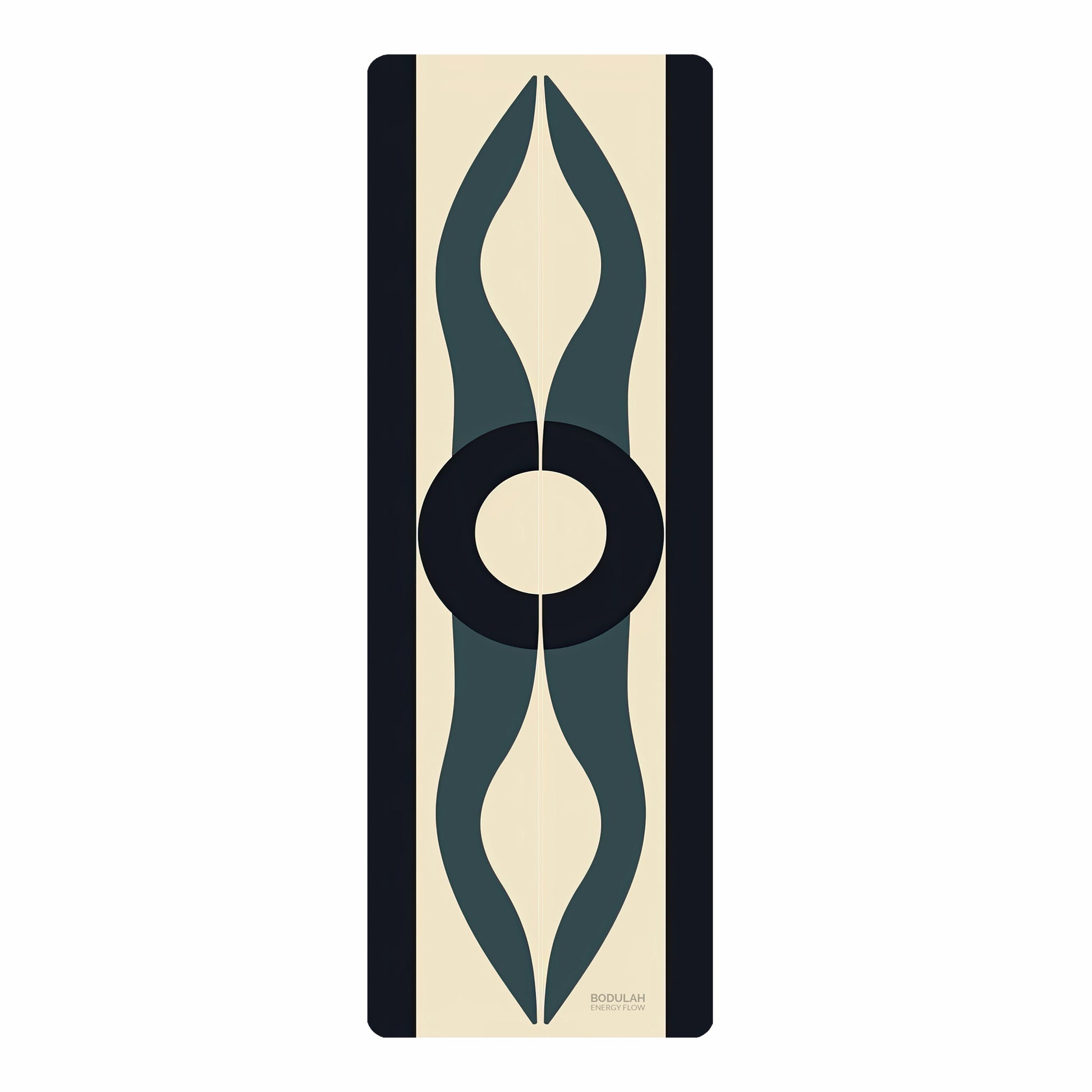Energy Flow 5 Yoga Mat is a meditation on balance. Its flowing teal forms curve inward toward a powerful center—a bold black circle that anchors and connects. This design reflects the cyclical nature of breath, energy, and being, inviting your body into union with rhythm and stillness.