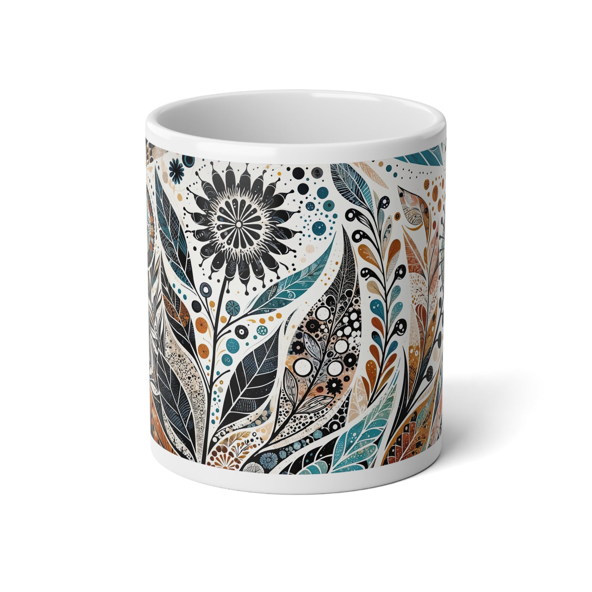 The Midnight Garden Symphony Jumbo Mug is a bold statement piece adorned with intricate botanical forms and rhythmic lines that dance in harmony across its glossy ceramic surface. Perfect for those who seek inspiration in both art and ritual, this 20oz mug transforms your daily coffee or tea into a serene moment of reflection and colour.